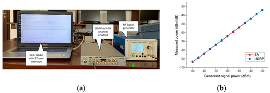 For calibrating the USRP RX channel, a continuous wave signal was generated with a signal generator and measured alternatively using the USRP RX interface and the SA. Figure 9a presents the experimental setup used for USRP RX channel parametrization. The multiplication constant in Figure 5 was modified to achieve agreement between the SA and USRP measured power values, as presented in Figure 9b.
