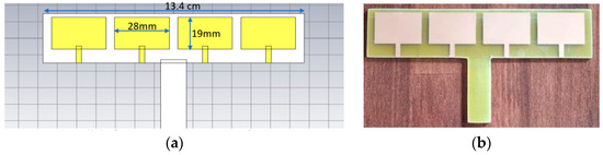 A customized 1 × 4 array of patch antennas was designed in CST Studio Suite to operate in the 3.5 GHz frequency range, emulating a device operating in the 5G FR1. The dimensions of each patch were set at 28 mm wide and 19 mm high, with a distance of 4.42 mm between each patch. To ensure proper feeding, each patch element was connected through a feeder with a width of 2.8 mm and a height of 8.32 mm, values calculated to obtain a characteristic impedance of 50 Ohms on each antenna port. In addition, to facilitate practical handling, an additional copper-free substrate element has been added to the bottom of the antenna to create a solid handle.