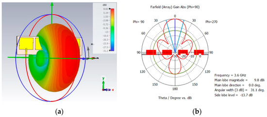 Figure 11 presents the array of patch antennas’ 3D radiation pattern(a) as well as the horizontal 2D radiation pattern (b), extracted from simulation for 0° phase offset between the patch elements. One can observe the forward direction of the main radiation lobe with the presence of two smaller sidelobes.