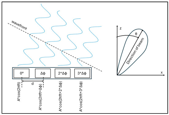 By modifying the phase of the signal fed to each patch element, the user can shift the beam towards the desired azimuthal direction. From phased array antenna theory [23], the azimuthal orientation or the steering angle of the beam (θ), relative to the forward direction, can be calculated based on the wavelength (λ), the element spacing (d), and the phase shift per element (ΔΦ) based on Equation (3). A schematic representation of the beamforming process for the designed patch antenna is presented in Figure 12.