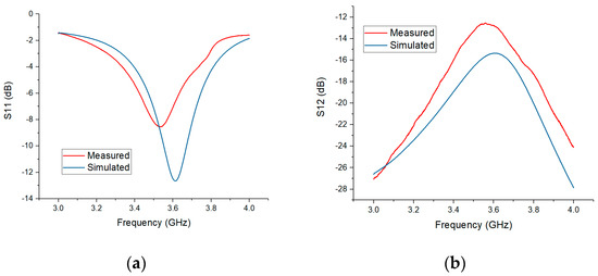 The S11 parameter in Figure 13a corresponds to a single patch element (the first), while S12 was measured between patch element 1 and 2. In the simulation, the antenna resonant frequency was 3.6 GHz, and the associated S11 value was −12 dB, while measurements indicated an actual resonant frequency at 3.53 GHz, with a measured S11 parameter of −8.5 dB. The observed 70 MHz shift in the resonant frequency (from 3.6 GHz to 3.53 GHz) is relatively small (around 2%). However, the S11 discrepancy indicates that the antenna reflects more power than expected, suggesting either increased losses or a mismatch between the antenna and its feed.