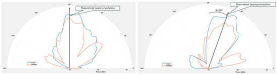 Outdoor measurements revealed that the 90° beam orientation was in good agreement with the simulation results, as presented by Figure 11. For the 20° tilt beam orientation, we can once again observe the presence of the two sidelobes in the outdoor measurement results, while only one sidelobe is visible in the indoor setting. Also, for the second beam orientation, one can observe good agreement with the analytically derived solution, supporting a 20° beam steer compared to the no-phase-difference scenario. These observations validate the beamforming platform’s effectiveness in achieving the desired beam orientation while demonstrating the influence of environmental factors on the radiation pattern.