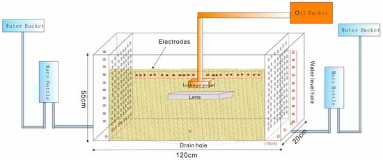 In summary, researchers have employed a suite of innovative experimental and simulation techniques, including two-dimensional flume experiments, high-density resistivity imaging technology, magnetic resonance imaging (MRI), and laser-induced fluorescence (LIF) technology, to delve deeply into the migration behavior of light non-aqueous phase liquids (LNAPLs) under various environmental conditions. These studies have uncovered a key phenomenon: after an LNAPL leaks, due to its unique physicochemical properties, it does not penetrate the water table to continue migrating downward but tends to accumulate and remain stable in the unsaturated zone, resistant to natural degradation. This characteristic leads to the long-term contamination of soil and groundwater resources. Furthermore, the research has found that the type of LNAPL, the initial soil moisture content, the specific location of the leak, and the abrupt interfaces in geological structures all significantly affect the migration pathways and rates of the LNAPL. These findings are crucial for predicting and simulating the migration of LNAPLs. Researchers have also further explored how natural conditions such as rainfall events and changes in groundwater levels affect the redistribution of LNAPLs through simulations. In reality, fluctuations in the groundwater table can significantly impact the redistribution of a residual phase LNAPL within the smear zone. These secondary sources often lead to persistent contamination of both groundwater and soil [28,29]. Although research on LNAPLs has been conducted by scholars in both field investigations and laboratory studies, the medium arrangement in existing experimental sandboxes is relatively simple, with most focusing on the migration patterns of LNAPL under homogeneous medium conditions, and few considering the conditions under different lens-shaped bodies. Moreover, these research methods often rely solely on direct observation or high-density electrical methods, which have their limitations.