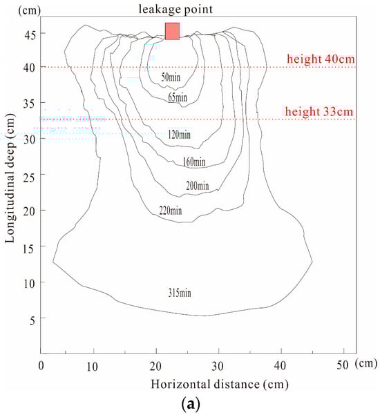 After leaking in homogeneous fine sand, the LNAPL formed an ellipsoidal shape and diffused uniformly in all directions. The degree of vertical diffusion was greater than the horizontal, with vertical migration fronts appearing rounded and smooth. This indicates that the vertical migration speed was rapid. In contrast, some horizontal migration fronts exhibited a jagged, folded distribution, suggesting the presence of small-scale medium heterogeneity within the soil matrix. As observed from the migration profile diagram in Figure 3a, the horizontal migration velocity of the LNAPL gradually decreases over time. The vertical migration velocity can be divided into three phases. In the early stage (first 65 min), the LNAPL migrated horizontally and vertically due to gravity and capillary forces, with horizontal migration initially faster than vertical, at rates of 0.18 cm/min and 0.15 cm/min, respectively. This was due to the significant capillary force in the fine sand, favoring early horizontal spread. However, as the diesel volume increased, vertical migration rates rose to 0.17 cm/min, surpassing horizontal rates, due to the oil’s weight. During the middle stage (65–160 min), horizontal migration contracted at 33 cm depth, as increased water content in the medium reduced LNAPL adsorption and decreased medium porosity, increasing capillary resistance and slowing LNAPL infiltration. In the late stage (160–315 min), vertical migration slowed and the oil front widened horizontally, as the LNAPL accumulated at the capillary fringe, favoring horizontal migration. The continuing leak intensified the LNAPL’s gravitational force, surpassing capillary forces, allowing the LNAPL to displace water and continue migrating slowly until the leak stopped.