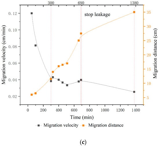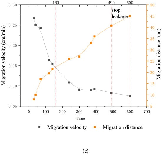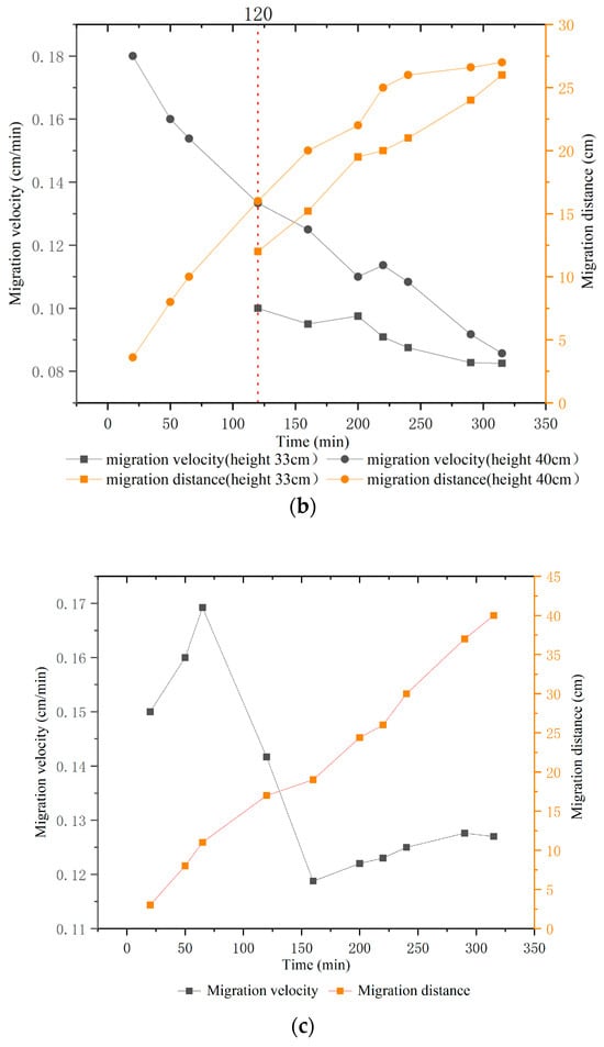 Variation in the LNAPL migration velocity (high-permeability lens). (a) Migration process. (b) Lateral migration velocity at different heights. (c) Vertical migration velocity.