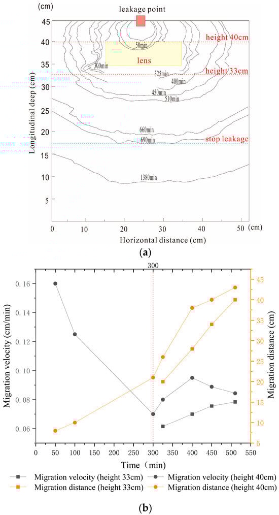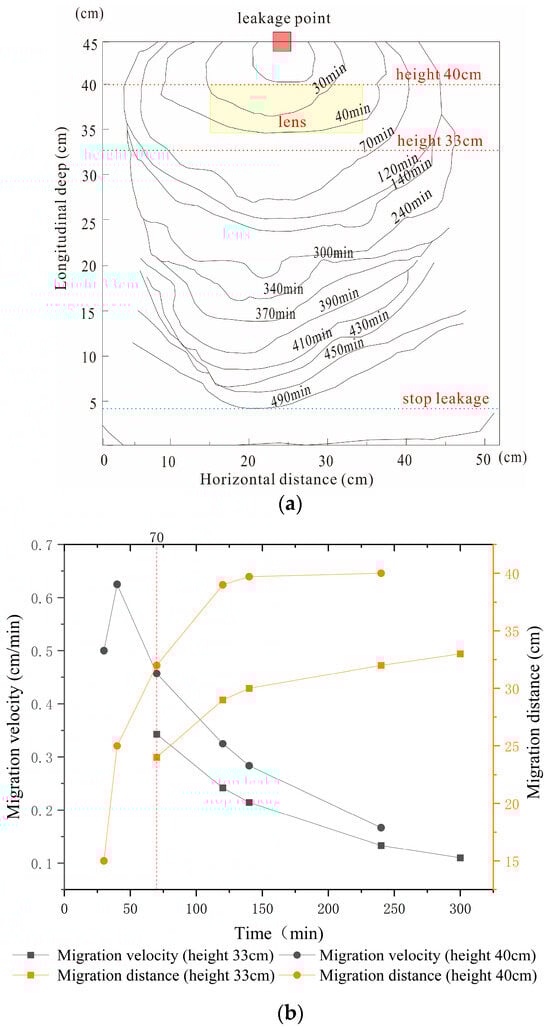 In the first stage (0–300 min), initially, the LNAPL migrated like in homogeneous sand, with a horizontal rate of 0.16 cm/min exceeding the vertical rate of 0.12 cm/min. Upon encountering the clay lens, the oil front was disrupted due to reduced permeability, impeding vertical migration. Despite this, some LNAPL infiltrated the lower part of the lens due to higher leakage rates at the center. Most of the LNAPL bypassed the lens, converging at its lower part with a vertical rate surpassing the horizontal rate of 0.16 cm/min. In the second stage (300–690 min), the LNAPL accumulated at the lens’s lower part from 300 to 510 min, with horizontal migration rates rebounding and vertical rates continuing to decline as the distance exceeded 20 cm. From 510 to 690 min, as more LNAPL accumulated, the vertical migration rate slowly increased. Overall, horizontal diffusion was more pronounced than vertical.