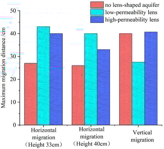 During the LNAPL leaks, vertically, the migration distances were greatest with a high-permeability lens (45 cm), followed by no lens (40 cm), and least with a low-permeability lens (35 cm). Horizontally, when reaching the upper part of the lens, the migration distances were greatest with a low-permeability lens, then a high-permeability lens, and finally no lens.