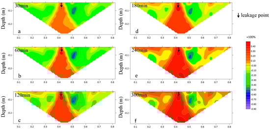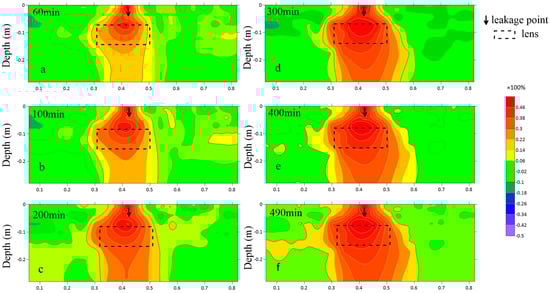 When there is a high-permeability lens in the medium, it forms a preferential channel within the lens, causing the LNAPL to migrate mainly vertically, with some horizontal migration. When leaking for 60 min, the LNAPL migrates downward through the inside of the lens to the buried depth of 0.15 m. Currently, the horizontal diffusion range also starts to increase, and the migration distance in the horizontal direction increases from 0.05 m to 0.15 m. When diesel oil leaks for 300 min, the resistivity rate of change reaches the maximum value, and the area of the resistivity growth area is obviously increased from Figure 9d,f. The width of the growth area becomes larger and gradually deepens in the vertical direction but, in general, the resistivity growth area is significantly increased from Figure 9d,f. The width of the growth area becomes larger not only in the horizontal direction, but also deepens gradually in the vertical direction. Generally, the vertical migration is larger than the horizontal migration, and the vertical change rate is 30–50%.