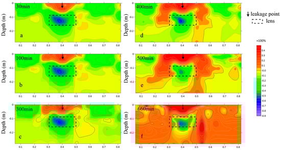 When there is a low-permeability lens in the medium, when LNAPL reaches this lens body, the vertical migration is blocked, and the resistivity change rate is 50%. When the diesel oil leaks for 100 min, it can be observed that the horizontal diffusion rate of the LNAPL is greater than the vertical diffusion rate. At this time, the resistivity change rate of the leak point is 50%, and the high resistance is mainly concentrated in the diffusion around the leak point as the center (Figure 8). When the leakage is 200–300 min, the LNAPL further accumulates and diffuses at the location of the leakage point, and due to the existence of the low-permeability lens [34], the vertical migration of LNAPL above the low-permeability lens gradually decreases, after which there is an obvious bypass phenomenon [35]. After the LNAPL bypasses the lens, both horizontal and vertical diffusion ranges expand, with resistivity changes between 10–25%. As shown in Figure 8d,e, after 300 min of leakage, diffusion increases further, though horizontal migration remains smaller than vertical. The resistivity change rate inside the low-permeability lens tends to rise due to the slow infiltration of the LNAPL, which does not reach saturation levels because of the lens’s low permeability, maintaining the resistivity change rate at 10–25%. In contrast, the saturated state shows a resistivity change rate of around −40%. Figure 8f indicates that the resistivity change rate below the lens gradually increases, suggesting the LNAPL migrates to the lens’ bottom under capillary action post-bypass. However, the top of the lens shows a resistivity change rate of 30–50%, while the bottom has about 10%, with the top exhibiting higher resistivity than the bottom of the lens.