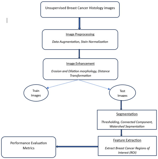 This proposed approach achieves pre-processing and segmentation of unsupervised BC histology images through the following steps: