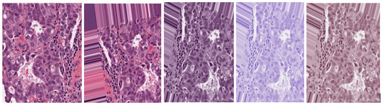 Minimum and maximum vectors are calculated and projected back to the OD space. The Hematoxylin stain corresponds to the minimum vector while the Eosin stain is the maximum vector. Stain concentrations are determined to form a matrix representing RGB channels and OD intensities respectively. This study has values of and set at 1 and 0.15 respectively. Figure 2 shows original, augmented, normalized H&E, normalized H, and normalized E breast cancer histology images respectively. After this stain normalization process, our proposed approach focuses on the normalized H image (image with only nuclei objects), having isolated from the greater normalized H&E image set.