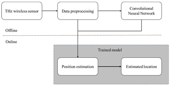 The process begins with the collection of high-frequency THz signals using a wireless sensor network. These sensors capture the raw data that form the basis for further processing. The raw THz data are pre-processed to enhance the quality of the input for the machine learning model. The steps involve noise reduction, normalization, and feature extraction to ensure that the data are in the proper format for analysis. The pre-processed data are then fed into a CNN, which is responsible for learning the spatial features of the data. Next, the CNN parameters are passed to the position estimation block, which produces an estimated location based on the learned features. Finally, the estimated location is input to a module that refines the CNN output by using algorithms to achieve higher positioning accuracy.