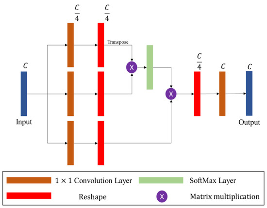 Initially, the feature map is processed by three separate convolutional layers to generate the key, query, and value maps, respectively. Each of these convolutional layers uses a kernel and outputs a feature map with channels. Next, the key and query maps are multiplied together, and the result is passed to a SoftMax function to generate the attention map. This attention map reflects the importance of different parts of the input feature map. It is multiplied by the value map to produce an intermediate tensor with dimensions that is then processed through a final convolutional layer.