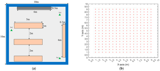 Figure 5a shows the floor plan of the actual simulation environment. Three transmitting antennas, each positioned at a height of 1 m, are located at Tx1 (9.5, 1.0, 1.0) m, Tx2 (0.5, 5.5, 1.0) m, and Tx3 (9.5, 9.0, 1.0) m, respectively, for positioning. Placing the transmission antenna in the corner is a deliberate arrangement. If it were positioned in the center of the indoor area, then naturally, all receiving antennas would receive the best transmission signals. By placing the antenna in the corner, we can determine whether the transmission signals received by receiving antennas in different locations behave as expected. Specifically, in the peripheral corners, the greater distance or the transmission signals that have undergone more reflected waves result in a larger RMSE (Root Mean Square Error) for the receiving antennas. There is one wooden bookcase and one metallic bookcase on the right and upper side of the room. There are also three wooden tables positioned in the middle and lower sections. The heights of the bookcase and the table are 2 m and 0.7 m, respectively.