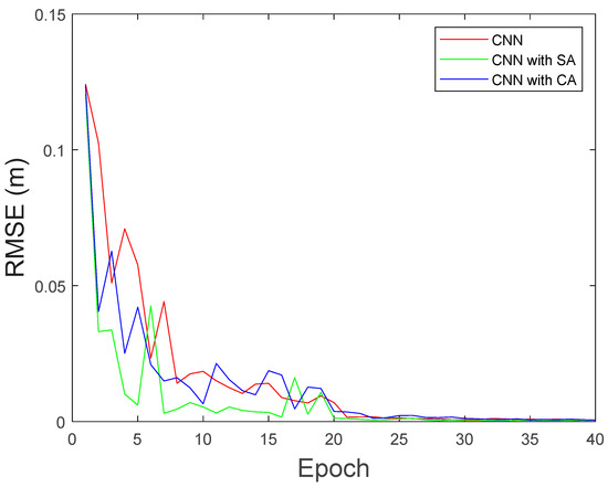 Table 1, the CNN with the SA mechanism generally achieves better performance compared to the CNN with the CA mechanism. RMSE versus epoch for all the LOS waves (three Txs case) is shown in