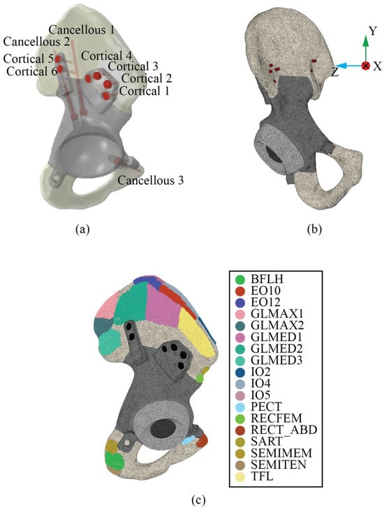 Post-operative assembly of the ipsilesional hemipelvis. (a) Geometric model of the post-operative pelvis assembly showing the layout of the nine screws securing the implant to the remaining bone. (b) Finite element (FE) model of the ipsilesional hemipelvis post-surgery. (c) Attachment areas of the muscle–tendon units retained after surgery and used in the model.