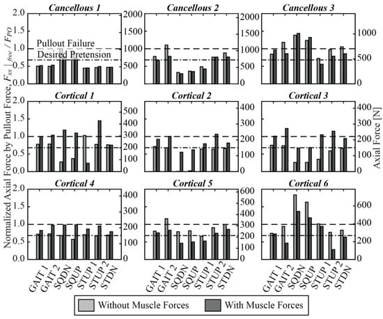 Predicted screw axial forces differed substantially between loading conditions without and with muscle forces (Figure 5). Cortical screws 1–4 generally experienced higher, and Cortical screws 5–6 lower, axial forces for all load cases when muscle forces were included in the FE analyses. The one exception was Cortical screw 1 for the STUP 1 load case. Furthermore, while Cortical screws 1–4 were generally below the pullout failure limit without muscle forces, they all reached or exceeded the pullout failure limit for multiple load cases with muscle forces. The notable exception was again Cortical screw 1 for the STUP 1 load case, which dropped from above to below the pullout failure limit when muscle forces were included. In contrast, cancellous screws demonstrated no clear trends in axial forces related to the inclusion or exclusion of muscle forces in the FE analyses. Nonetheless, for all three cancellous screws, between one and three load cases produced an axial force that was at or above the pullout failure limit without muscle forces and that dropped to below the pullout failure limit with muscle forces. On average, cortical screws experienced a larger absolute percent change in axial force than did cancellous screws when muscle forces were added.
