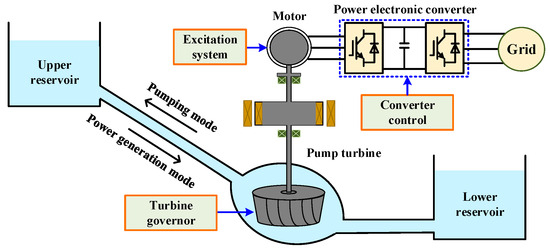 Figure 1 presents the detailed structure of the FSC-VSPSU, which mainly consists of upper/lower reservoirs, a pump turbine, a motor, and a power electronic converter. In addition, the control systems are mainly composed of a turbine governor, an excitation system, and a converter controller. The upper and lower reservoirs store water resources, and the pump turbine is a mechanical transmission part. These two components can collaborate to facilitate the reciprocal transformation between potential energy and mechanical kinetic energy. Furthermore, the pump turbine drives the motor to rotate to generate the electric energy, and the power electronic converter can achieve the controllable energy exchange with the power grid. By coordinating the turbine governor, the excitation system, and the converter controller, the FSC-VSPSU can operate efficiently [13].