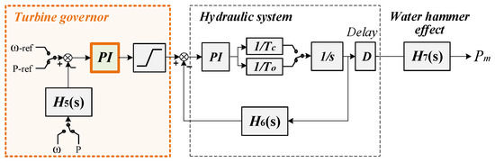 (2) For the turbine governor, it realizes the speed/power regulation of the pump turbine, and the specific structure is shown in Figure 3. In detail, H5(s) represents the speed/power sampling link; H6(s) is the delay of the hydraulic system; H7(s) is the transfer function to describe the water hammer effect; and Tc/To are the hydraulic servo motor’s closing/opening times [11]. Furthermore, the PI control in the turbine governor is crucial to the control performance of the pump turbine.