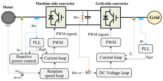 (3) For the converter controller, it can control the grid-connected power or the motor speed quickly. Taking the rapid control of the motor speed as an example, its structure diagram is presented in Figure 4. In detail, the grid-side converter facilitates the control of DC voltage through a dual-loop control strategy, wherein the inner loop governs the current, while the outer loop regulates the DC voltage. The machine-side converter controls the motor speed, which also adopts the double closed loop control, but with the rotation speed loop as the outer control loop [13].