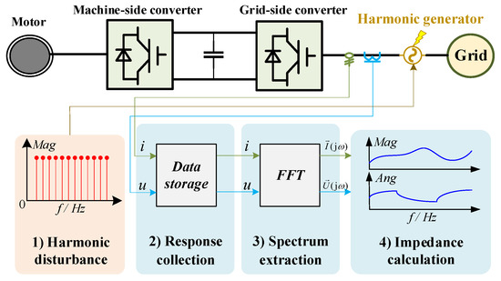 As for the FSC-VSPSU, the impedance measurement procedures are shown in Figure 5, which can be divided into four steps: (1) inject the controllable harmonic disturbance into the grid-connected point; (2) collect the voltage/current responses of the FSC-VSPSU; (3) extract the spectrum of the collected response data; (4) calculate the impedance with the extracted spectrum data. Specifically, to achieve more precise impedance measurement results, this study employs a frequency-sweeping disturbance method targeting a frequency band up to 100 Hz [22]. Additionally, for the collection of response data, the data buffer size is determined based on the quantity of data to be sampled (the product of the sampling rate and the sampling duration). The sampling rate is required only to comply with the Nyquist sampling theorem. The measurement period is defined as the reciprocal of the desired frequency resolution.