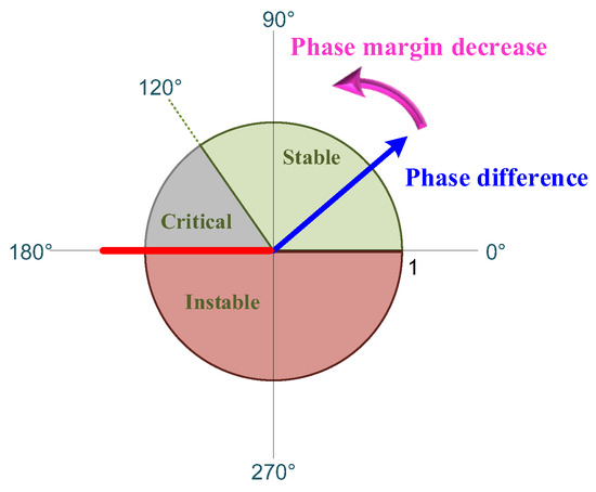 Based on the above analysis, the obtained oscillation criterion is shown in Figure 7. It is evident that within the green/stable region, the phase difference is less than 120°. A phase margin that is adequately robust ensures the maintenance of system stability. As the phase difference increases, the phase margin will decrease. However, the phase difference located in the grey/critical region with a weak phase margin may cause the corresponding harmonics to be amplified, and the system has a risk of oscillation. Moreover, when the phase difference is in the red/instable region, a negative phase margin will cause the system to oscillate severely, or it may even be unstable.