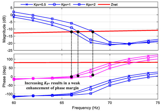 The specific analyses are as follows. (1) When Kpv is set to 0.5, the phase margin is approximately negative, which indicates that the system may experience oscillation. (2) When Kpv is increased to 1, the phase margin is slightly increased and higher than 0°, and thus the oscillation will be suppressed. (3) When Kpv is further increased to 2, the phase margin slightly increases, and the oscillation will be further weakened.