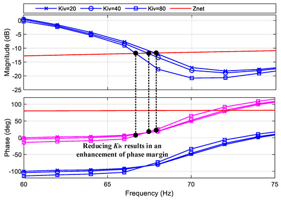 When changing the integration parameter of the DC voltage loop of the grid-side converter (Kiv), the relevant Bode diagram of the impedance matching analysis is shown in Figure 9. As it can be seen, at the intersections of the impedance amplitude curves, there is a relatively significant increase in the phase margin when Kiv is reduced. When Kiv is set to 80, the phase margin is weak and close to 0; hence, this system has a risk of oscillation. Furthermore, when Kiv is decreased to 40, the phase margin increases to around 15°, and the oscillation phenomenon that occurs in the system will be weakened to some extent. At last, when Kiv is decreased to 20, the phase margin further increases accordingly, and the oscillation will be further weakened.