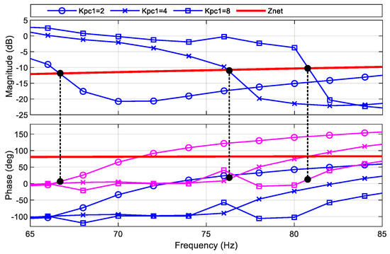 When changing the proportional parameter of the current loop of the grid-side converter (Kpc1), the relevant Bode diagram of the impedance matching analysis is shown in Figure 10. As it can be seen, when Kpc1 is set to 2, the phase margin is relatively minimal and close to 0°, which indicates that the system will oscillate. Furthermore, when Kpc1 is increased to 4, the phase margin is increased, and thus the oscillation will be suppressed. However, when Kpc1 is further increased to 8, the phase margin decreases, and the oscillation will reappear. Therefore, the regularity of the influence of Kpc1 on oscillation is not significant.