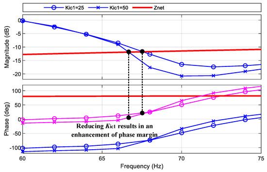 When changing the integration parameter of the current loop of the grid-side converter (Kic1), the relevant Bode diagram of the impedance matching analysis is shown in Figure 11. As it can be seen, when Kic1 is set to 50, the phase margin is weak and close to 0; thus, this system has a risk of oscillation. Furthermore, when Kic1 is decreased to 25, the phase margin is increased, and the oscillation phenomenon that occurs in the system will be suppressed.
