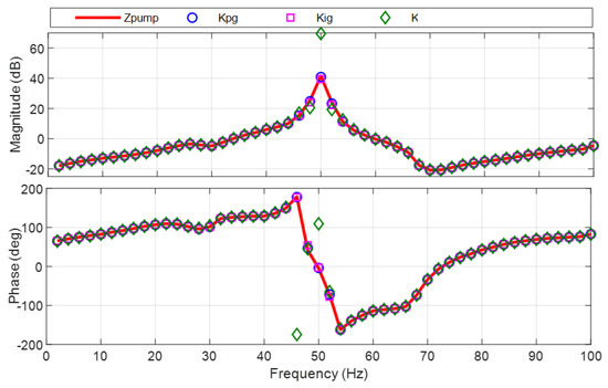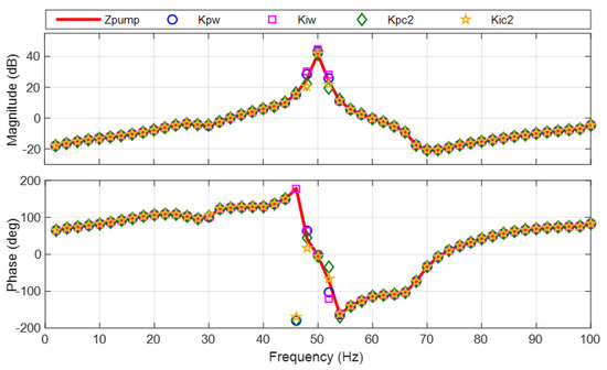 Upon adjustment of the parameters associated with the rotation speed loop and the current loop of the machine-side converter, the pertinent single-input–single-output (SISO) impedances of the FSC-VSPSU are illustrated in Figure 12. In detail, the red line represents the initial FSC-VSPSU impedance, and “○”, “□”, “◇”, and “✩” represent the measured SISO impedances when changing Kpw, Kiw, Kpc2, and Kic2, respectively. Kpw and Kiw are the proportional and integration parameters of the rotation speed loop, respectively, and Kpc2 and Kic2 are the proportional and integration parameters of the current loop of the machine-side converter, respectively. As it can be seen, when changing Kpw, Kiw, Kpc2, and Kic2, the SISO impedance of FSC-VSPSU remains almost unchanged. Therefore, the corresponding control parameters of the machine-side converter have a weak impact on oscillation occurring in the grid-connected point.