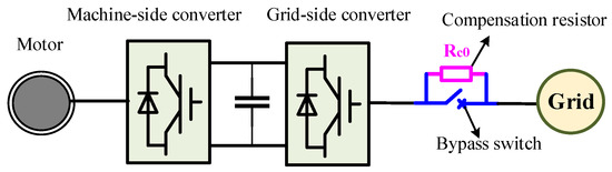 From Table 1, reducing Lg or appropriately increasing Rg can suppress the oscillation of the grid-connected FSC-VSPSU. However, for the actual operating grid network, reducing its equivalent inductance is difficult to achieve. Therefore, the following will study the oscillation suppression strategy by increasing the equivalent resistance of the grid network, and the corresponding schematic diagram is shown in Figure 16. When the system operates stably, the bypass switch is closed, causing the compensation resistor (Rc0) to be short-circuited. Furthermore, when the system experiences oscillation, the bypass switch is opened, and the Rc0 is connected to the system in series, which increases the equivalent resistance of the grid network to suppress the occurring oscillation.