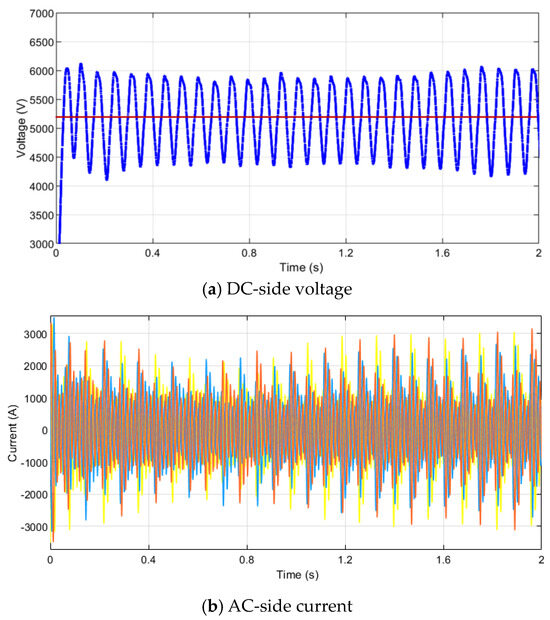 Under the parameters listed in Table 2, the system will experience oscillation, which is shown in Figure 17. As it can be seen, when observing the oscillation of the DC-side voltage, the current on the AC side also oscillates at the same frequency. Notably, the three different colors in Figure 17b represent the three phases in the power system. To prevent the article from being too lengthy, only the DC-side voltage is provided to demonstrate the stability of the system in the following content. Furthermore, to verify the correctness of the oscillation analysis results, the following content will analyze the oscillation changes when adjusting the corresponding parameters.