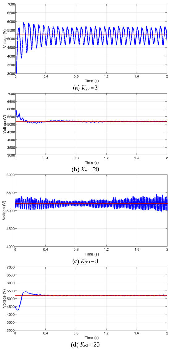 Figure 18 gives the simulation results when changing the control parameters of the grid-side converter. As it can be seen, when Kpv is changed to 2, the oscillation phenomenon observed in Figure 18a exhibits a noticeable reduction in intensity when contrasted with the curve presented in Figure 17. A similar result can also be seen in Figure 18c when Kpc1 is changed to 8. As a result, these two control parameters have a weak performance in completely suppressing the oscillation. Therefore, “×” is used to label them in Table 1.