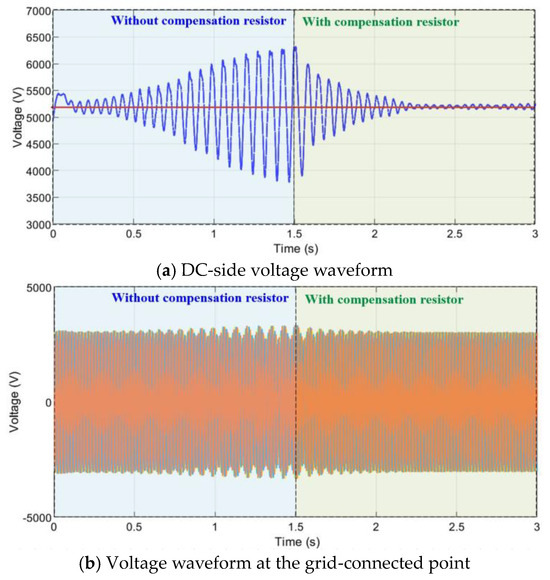 Figure 22 gives the simulation results when applying the oscillation suppression strategy at 1.5 s. As it can be seen, when without the compensation resistor, the system oscillates and gradually diverges. Furthermore, when the compensation resistor is applied at 1.5 s, the oscillation gradually decreases and eventually returns to a stable operating state, which verifies the effectiveness of the proposed suppression strategy.