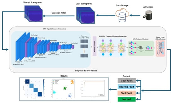 The proposed method involves converting AE signals into CWT scalograms, applying Gaussian filtering, using a CNN architecture with BiLSTM, enhancing it with GA, and following this with a fully connected layer for multiclass fault classification. The complete workflow of the proposed hybrid model is shown in Figure 1. The proposed method can be explained as follows.