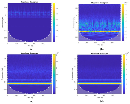 CWT scalograms of AE signals: (a) scalogram of the normal condition; (b) scalogram of a tool fault condition; (c) scalogram of the gear fault condition; and (d) scalogram of a bearing fault condition.