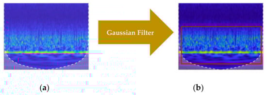 CWT scalograms before and after applying a Gaussian filter: (a) CWT scalogram before filtering and (b) CWT scalogram after filtering.