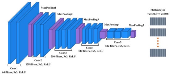 In this work, CNN extracts and processes features from CWT scalograms derived from AE signals. By using a convolutional layer for feature detection, pooling layers for dimensionality reduction, and flattened layers for preparing the data for the next round of processing, CNN enables efficient fault diagnosis in milling machines. Figure 4 is the architecture diagram of the CNN for the proposed method. The specific CNN architecture used in this study is based on the VGG16 model, a well-established CNN known for its depth and performance in image recognition tasks. The VGG16 model’s convolutional base is pre-trained on the ImageNet dataset, and its weights are frozen to preserve the learned features. Custom layers, including a flattened layer, are added on top of the VGG16 base to adapt the model to specific fault detection.