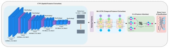 In this study, a hybrid deep learning model for fault diagnosis and classification in milling machines, combining the strengths of a CNN, BiLSTM networks, and a GA, is proposed. The architecture of the hybrid model is shown in Figure 8, which provides a visual overview of the proposed model’s key components and data flow.