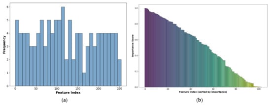 Feature importance: (a) distribution of features and (b) feature importance of 103 selected features after GA.
