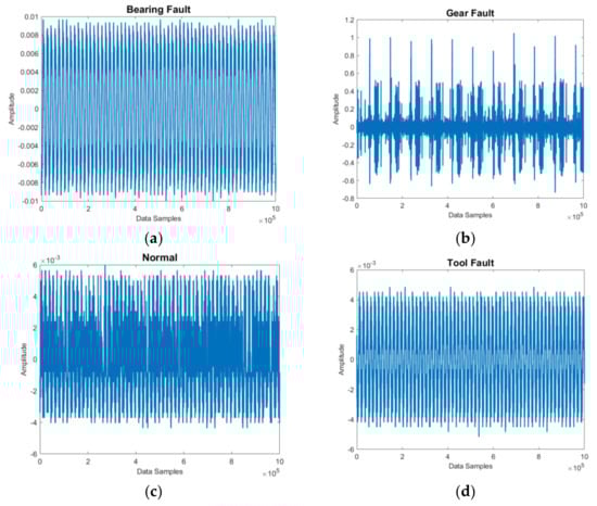 AE time domain signals for different fault conditions: (a) Bearing Fault sample; (b) Gear Fault sample; (c) Normal sample; and (d) Tool Fault sample.
