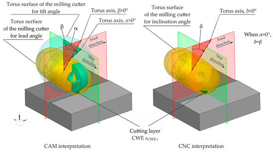 In the present work, in order to obtain the orientation of the tool axis for the kinematic variant of TPL (tool pulling) multi-axis cutting, the inclination angle was used as the process adjustment variable. In the present work, in order to obtain the tool axis orientation for the kinematic variant of TPL (tool pulling) multi-axis cutting, the inclination angle was used as the process adjustment variable. It is the same as the advance angle in this variant. The lead angle β, along with the tilt angle α, is an essential adjustable variable in CAM systems at the pre-processing stage. On the other hand, in the NC code, based on the conversion relationship between angles β and α, the inclination angle setpoint adjustable variable δ obtained in the post-processing stage of the CAM system is derived and, in this version, interpreted by the CNC control of the machine tool. Figure 1 illustrates the set variables of the tool axis, and the conversion relationship is described by Equation (1). Equation (2) defines the condition when the inclination angle is the same as the lead angle.