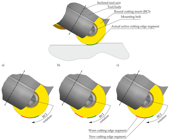 The first illustrated case (Figure 2a) shows the overlap of part of a new cutting edge segment with a worn segment. This erroneous angular position can result in significant deterioration of the technological surface layer and progressive catastrophic tool wear. The second case (Figure 2b) illustrates the occurrence of an excessive gap between adjacent segments after uncontrolled rotation of the RCI. In turn, this erroneous angular position reduces the cutting capacity of the tool due to incomplete use of the entire cutting edge. In contrast, the third case (Figure 2c) illustrates a worn and new segment, directly adjacent to each other. This will only happen if the rotation of the round cutting insert around the axis of the mounting hole is controlled.