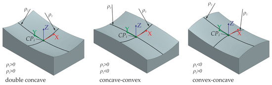 In order to develop an angular positioning method for round cutting inserts of the torus milling cutter, dedicated to the multi-axis milling process, it is first necessary to determine the minimum required inclination angle δ. The minimum inclination angle required is to ensure that the torus milling cutter axis is positioned in such a way that no undercutting of the workpiece surface occurs. Three surface types were selected in terms of shape: biconcave, saddle concave-convex, and saddle convex-concave. The selected sculptured surfaces are described by a radius of curvature radius ρ parameter (the inverse of the curve curvature) in the feed direction ρ1 and in the direction perpendicular to the feed ρ2, respectively. A negative sign was assumed for the radius of convex curvature and a positive sign for the radius of concave curvature, as illustrated in Figure 3.