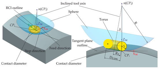 A sphere of radius R was used to determine the position of the tool in a way that excludes the possibility of the torus undercutting the machined surface. This method was first defined by Marciniak [36]. The common part of the sphere and the torus is the contact diameter, and the local position of the tool determines the contact between the torus and the machined surface at the CPi contact point, as shown in Figure 4. The inclination angle δ of the tool axis is defined relatively to the nornal vector n(CPi) of the machined surface at the contact point CPi. In generalizing the problem, the machined surface was assumed to be a strictly tangential plane. This plane, in turn, is a simplified model of any type of sculptured surface at the contact point between the torus and the machined surface.