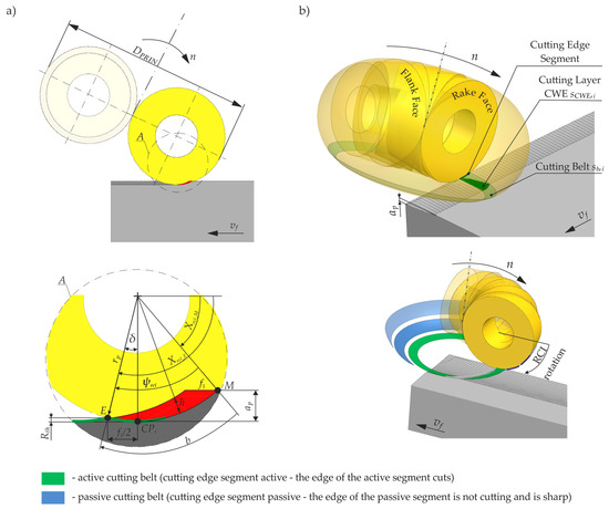 Thus, the active cutting belt can be determined (see Figure 5b) for a given inclination angle δ in the CWE. During the movement of the tool, the tool is in contact with the workpiece on a temporary patch of the machined surface, which is called Cutter-Workpiece Engagement (CWE), and the material removed is the cut layer in the form of a chip. The CWE is located on the torus action surface of the tool within the adopted depth of cut ap. As the tool rotates about its axis, the CWE sCWE,i at the contact point forms a belt sb,i, which was named the cutting belt, and is located on the action surface of the torus milling cutter. At any moment of cutting, the segment on the cutting edge that is inside the CWE is called the active segment of the cutting edge, i.e., the edge of the active segment is cutting at that moment. In addition, segments that are outside the CWE have been identified that are passive cutting edge segments, where the edge of the passive segment does not cut and is sharp.