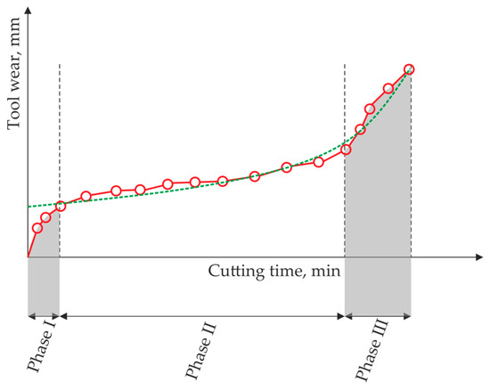 Furthermore, for wear modeling (dotted green line), i.e., using regression analysis [38,39,40], phase I can be neglected, and the tool wear at any cutting point on the torus action surface can be considered as a variable over time (such as in accelerated motion) and described by the model of an exponential function, which is expressed by Equation (10).
