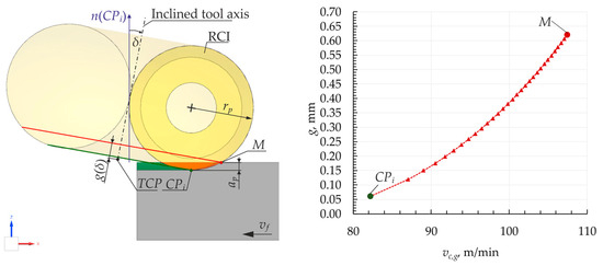 Basically, the inclination angle δ is spread and determined in a plane perpendicular to the cutting speed vector vc and passing through the contact point CPi in the CWE, which is the common point of the outline of the machined surface and the cutting edge of the tool blade. The geometry of the cut layer is considered in the same plane. The geometrical parameters of the cut layer have a significant influence on the physical and technological effects of the cutting process, especially multi-axis milling.