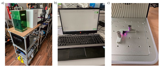Laser engraving workstation: (a) xTool F1 machine; (b) PC workstation with xTool Creative Space software (v2.2.23); (c) working space with fixed round cutting insert visible laser dot.
